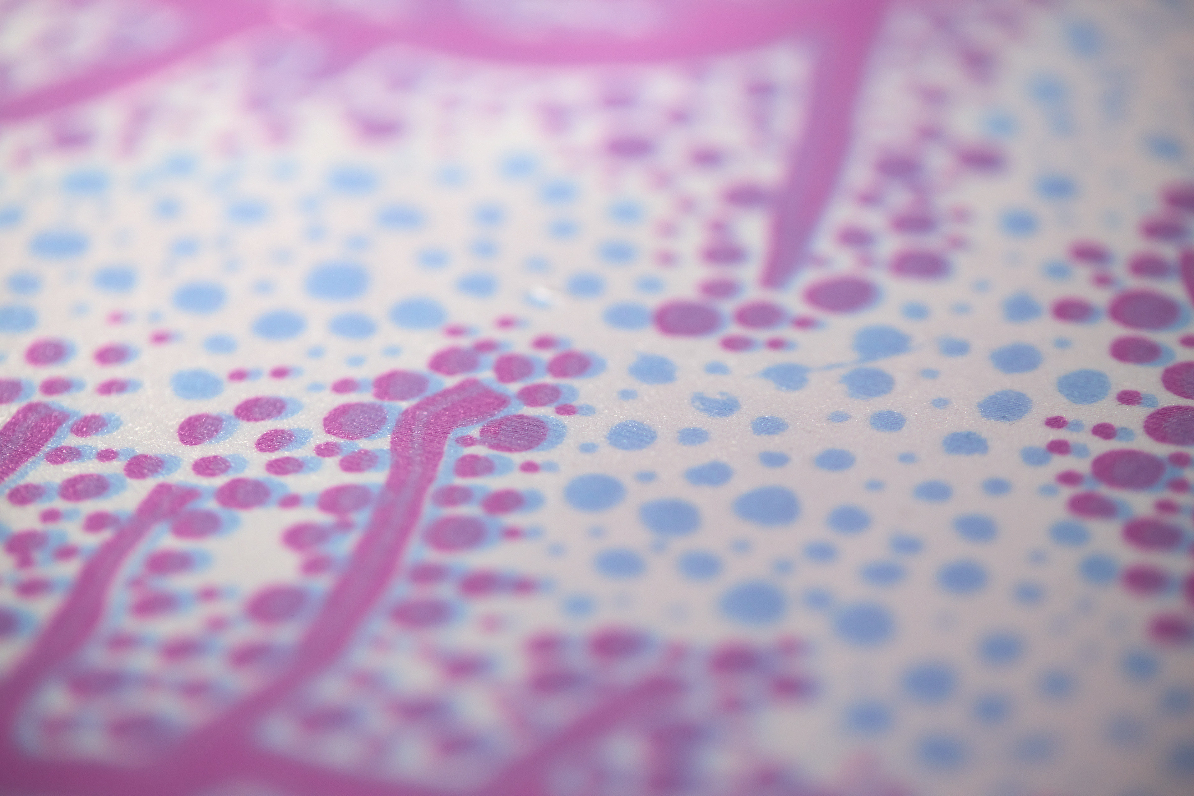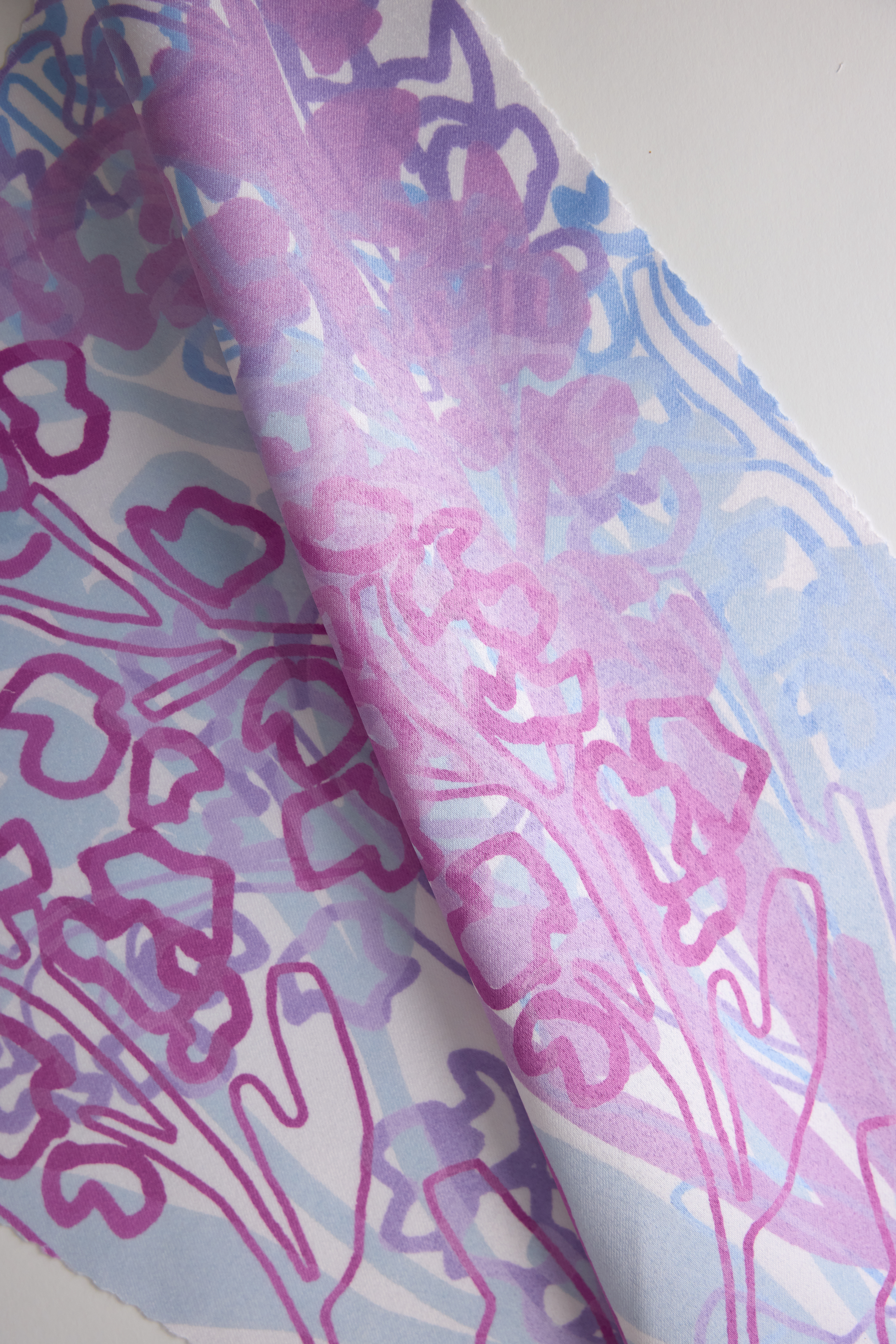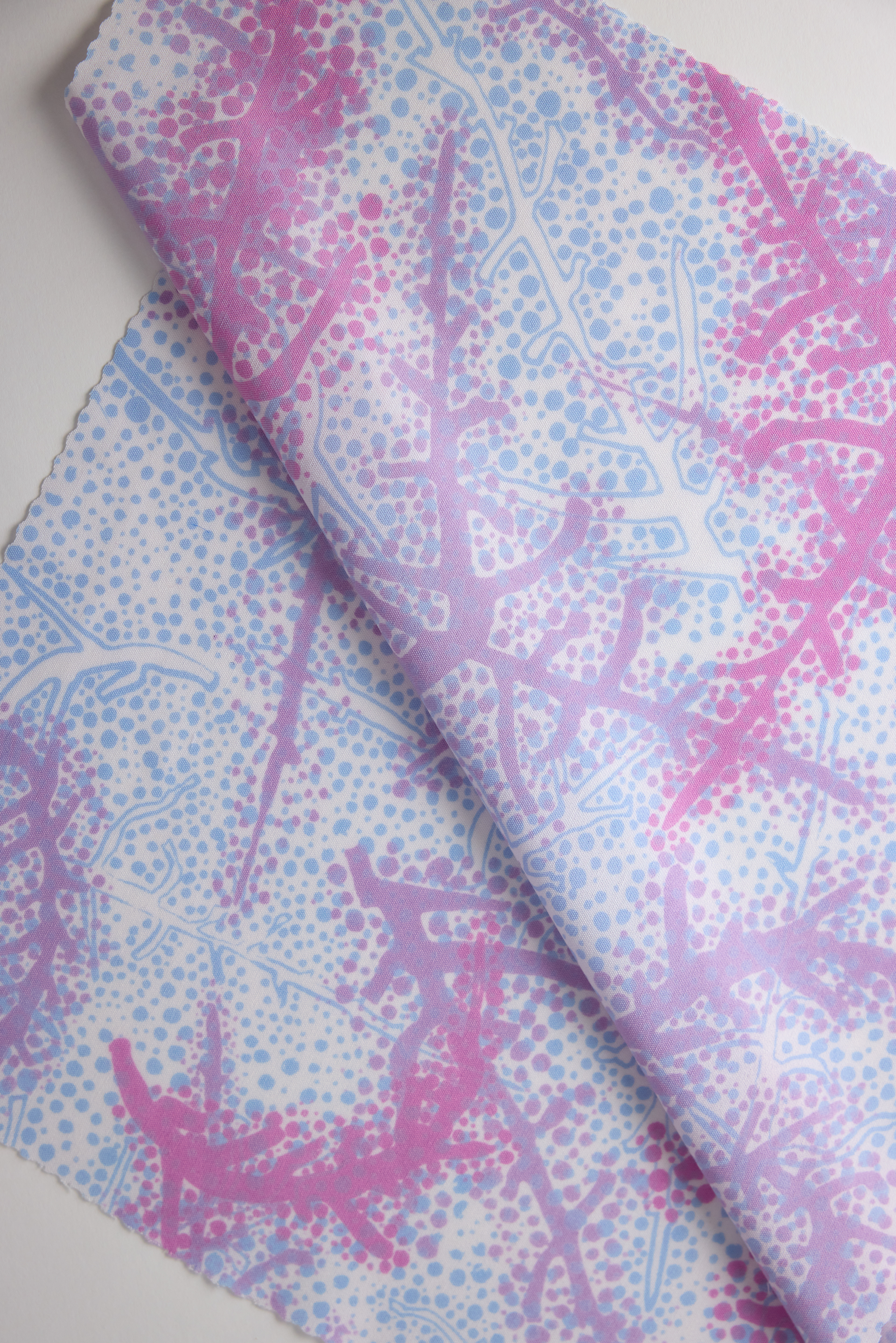 This body of work presents the first outputs from my doctoral research, produced in partnership with Colorifix. Using their proprietary microbial fermentation technology, I developed processes to adapt biologically produced pigments for industrial textile printing. These experimental samples represent an early proof-of-concept, demonstrating the feasibility of applying microbial colour at scale.